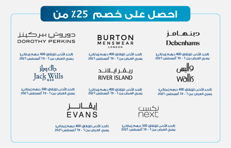 احصل على خصم يصل إلى 25٪ عند استخدامك بطاقة الخصم المباشر أو البطاقة المغطاة من مصرف أبوظبي الإسلامي للتسوق لدى علامات تجارية محددة في الإمارات العربية المتحدة!