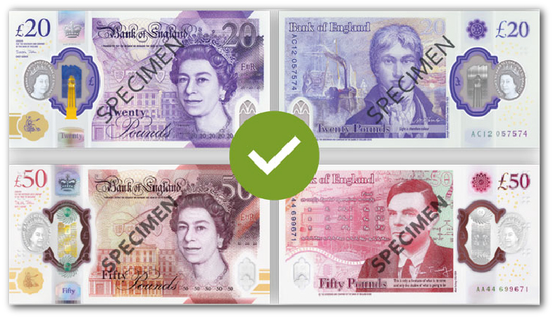 As paper notes are returned to the Bank of England, they are being replaced with the new polymer £20 notes featuring JMW Turner, and polymer £50 notes featuring Alan Turing.